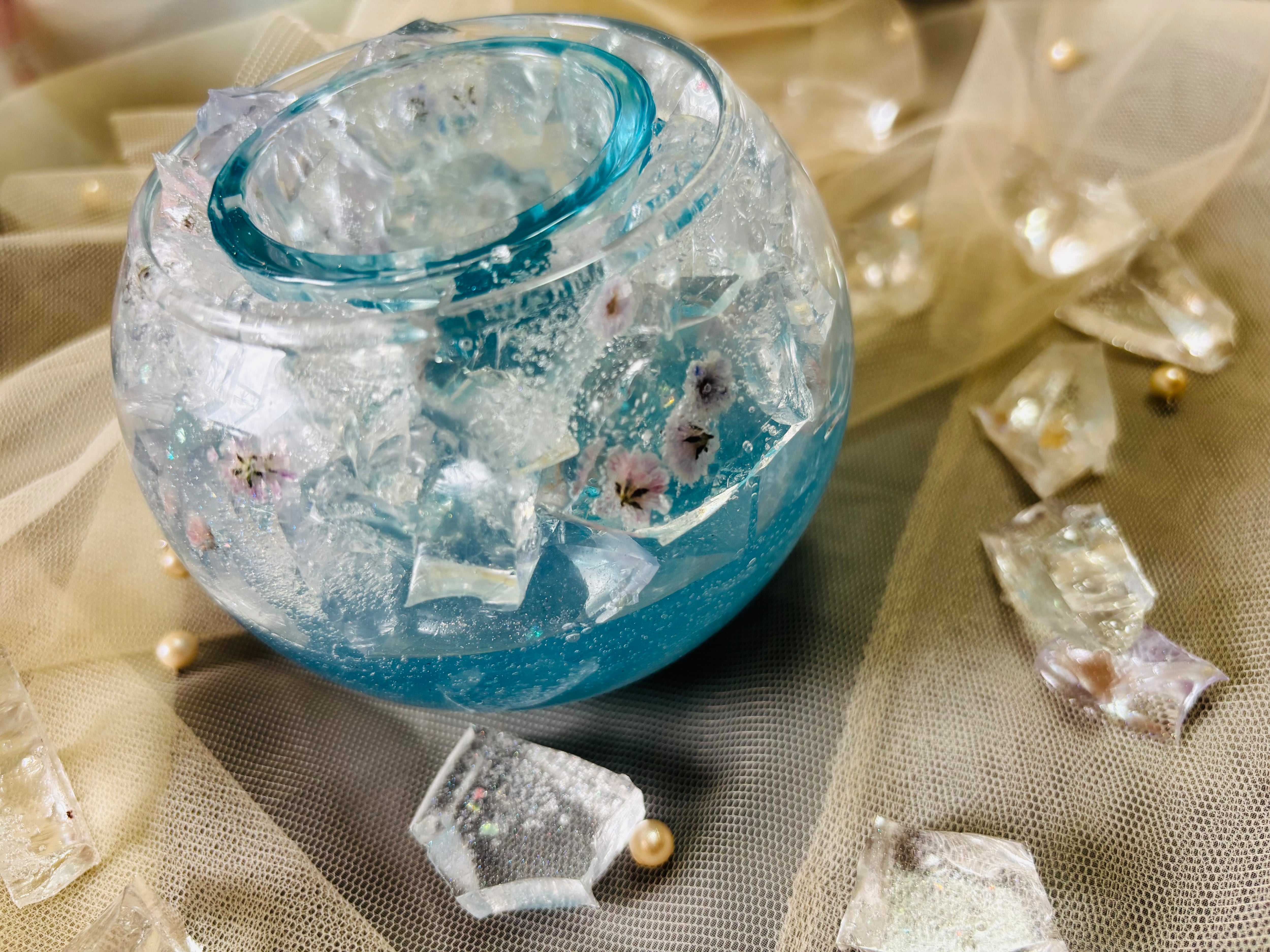 かすみ草のドライフラワーをジェルワックスで閉じ込め、ブルーのグラデーションが施されておりすごく可愛いデザインになりました♡